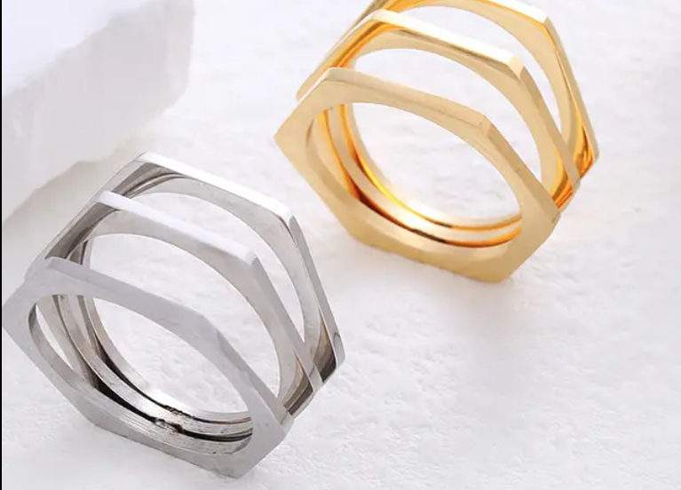 Three Line, hexagon shape rings Lightweight and can be perfectly paired with any piece in your wardrobe, these 18k gold plated hexagon shape ring for everyday that you will never want to take off.