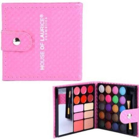 Kit includes twenty shades Eye shawdows, Six shades Lipsticks , three Contour colors, three Blush colors, Mirror, and Blending brush. All in one leather pink wallet great for travel.