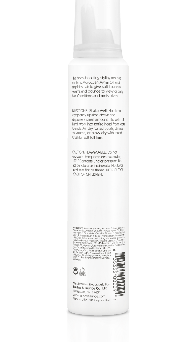 Conditions and moisturizes, (Argan) Oil - Deep penetrating oil that instantly absorbs into hair producing incredible shine, helps control frizz, softens and aids in curl definition, and conditions hair. Body hair mousse, vegan. Gives volume, bounce and body.